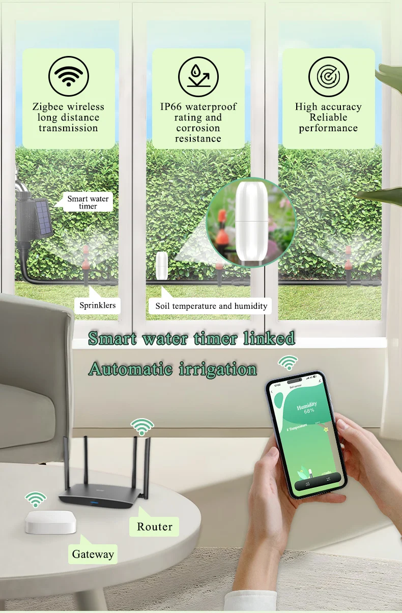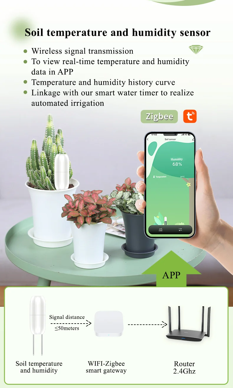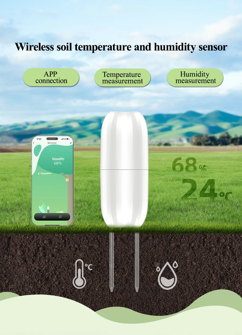 Wireless soil temperature and humidity measuring instrument, which can measure soil humidity and temperature at the same time, and connect to T-uya APP through Zigbee.