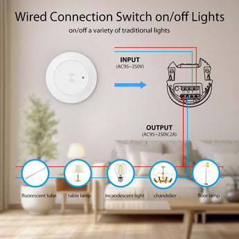 Directly connected to the light switch, output 95-250V 2A, to meet the intelligent needs of turningon the light when people come and turning off the light when people leave. It is simple and easy toinstall, more intelligent and more convenient