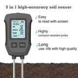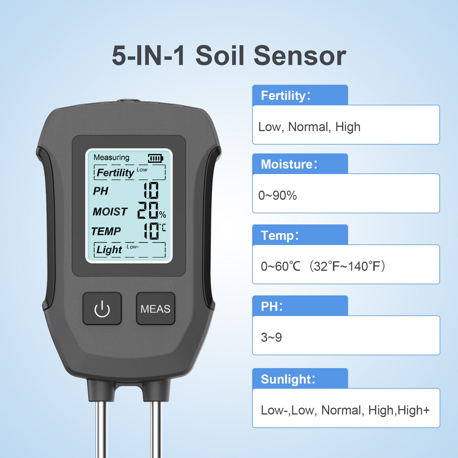 Haozee 5 en 1 Testeur de sol PH/Humidité/Température/Fertilité/Capteur de lumière LCD Numérique Moniteur d'humidité pour Fleurs Plantes Jardinage