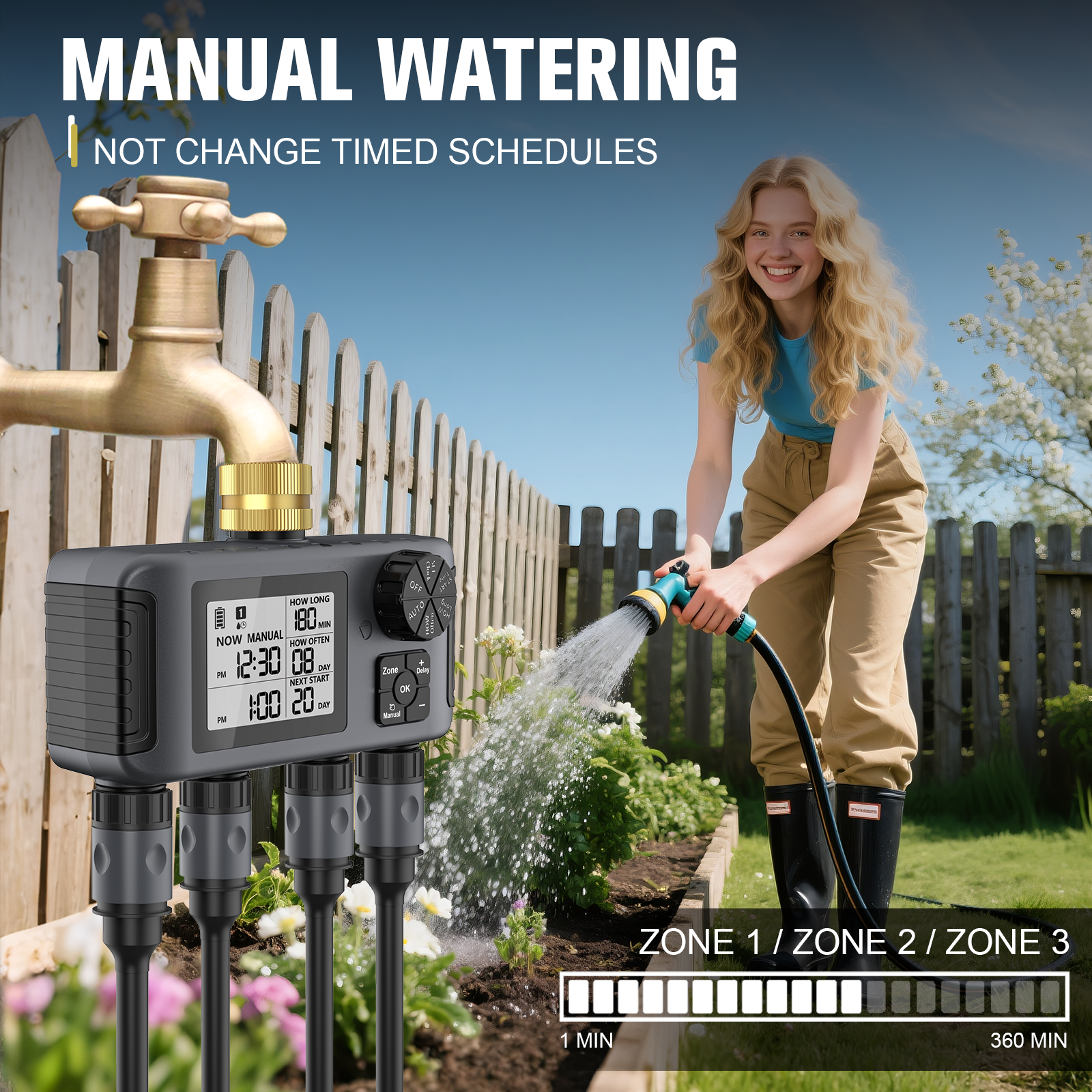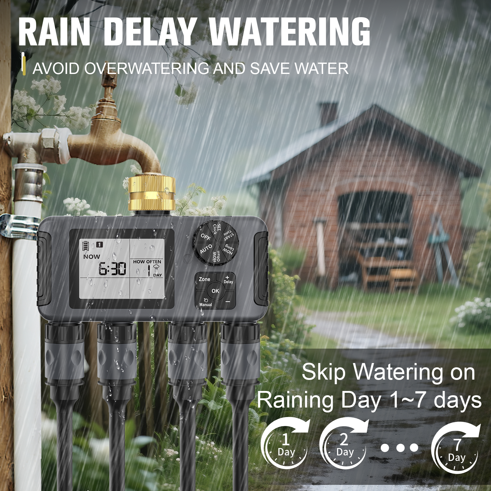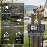 【Mode pluie différée et manuel】 Le mode pluie différée suspend votre programme d'arrosage pendant 1 à 15 jours, puis le reprend automatiquement. En mode manuel, vous pouvez arroser chaque pelouse ou jardin selon vos besoins, avec une durée personnalisable de 1 minute à 8 heures, sans interrompre votre programme d'arrosage.