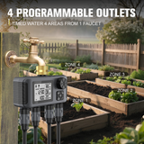 【Arrosage automatique avec 4 sorties】 : Le programmateur d'arrosage dispose de deux sorties d'eau indépendantes. Une vanne d'eau séparée vous permet de programmer des heures d'arrosage pour plusieurs zones de votre jardin. La durée d'arrosage varie de 1 minute à 3 heures, et la fréquence d'arrosage de 1 heure à 23 heures ou de 1 jour à 15 jours. Vous pouvez ainsi personnaliser votre programme d'arrosage et le rendre plus précis.