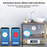 Scènes automatisées à utiliser avec les détecteurs de fuites d'eau : grâce à l'application Tuya, les utilisateurs peuvent configurer des scènes pour fonctionner avec le détecteur de fuites d'eau Tuya WiFi (1 capteur d'eau WiFi est inclus), comme fermer automatiquement une vanne lorsqu'une fuite d'eau est détectée.